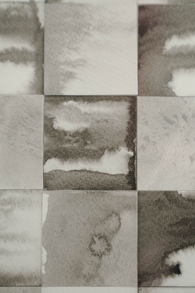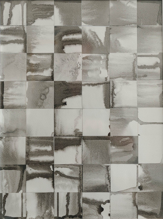 "Fumée" est une œuvre de poésie visuelle, un collage composé de 48 carrés de papier, où se mêlent aquarelle, monotype et techniques de coulure.