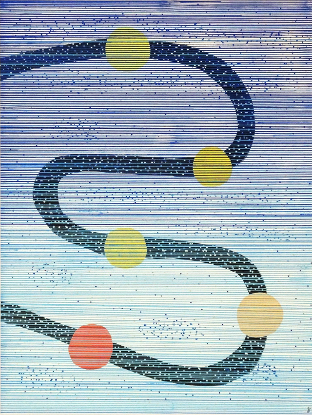 La superposition des éléments crée une vibration visuelle singulière : la transparence devient un langage, révélant, dissimulant ou altérant les couleurs. Les formes suspendues sont interdépendantes du rideau de traits horizontaux : sans elles, la transparence perdrait tout son sens. Ces lignes évoquent aussi les trames des tissages textiles, où chaque fil participe à la construction du motif global.